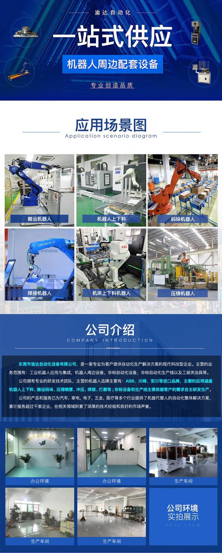 东莞渝达自动化立足于自动化行业,耕种于机器人搬运、码垛、上下料、焊接、压铸应用与非标自动化。其中非标自动化主要是龙门桁架机械手与定制设计的机器人配件,都是为自动化服务的定制化设备。凭借自动化化解决方案,优质的定制配套设备,实惠的价格,放心的售后,已经为成百上千的企业提供自动化方案与应用。