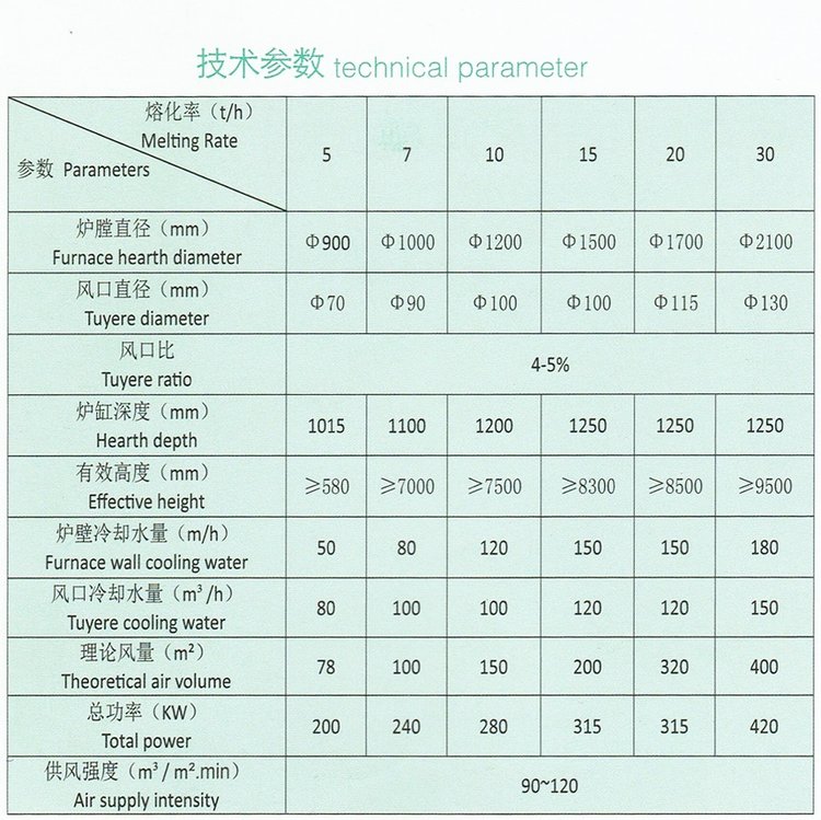 水冷无炉衬长炉龄冲天炉是我公司与省铸造锻压研究所密切合作,研制开发的一种新炉型。其冲天炉风口区及熔化带采用无炉衬结构,外喷淋水冷锥形炉壳,冷却均匀,运行直观可靠。采用插入式水冷风口,炉径不会随熔化时间发生变化,熔化参数稳定,可实现长时间连续熔炼。水冷风口选用优质铜板加工焊接而成,焊缝100%探伤及整体水压试验,制作优良,使用寿命长。风口与风管采用球面压紧,热膨胀自身调节,降低更换风口工作量。技术成熟,效益显著,是大中型铸造企业长效熔炼、提高铸件品质、降低铸件成本的优良炉型。